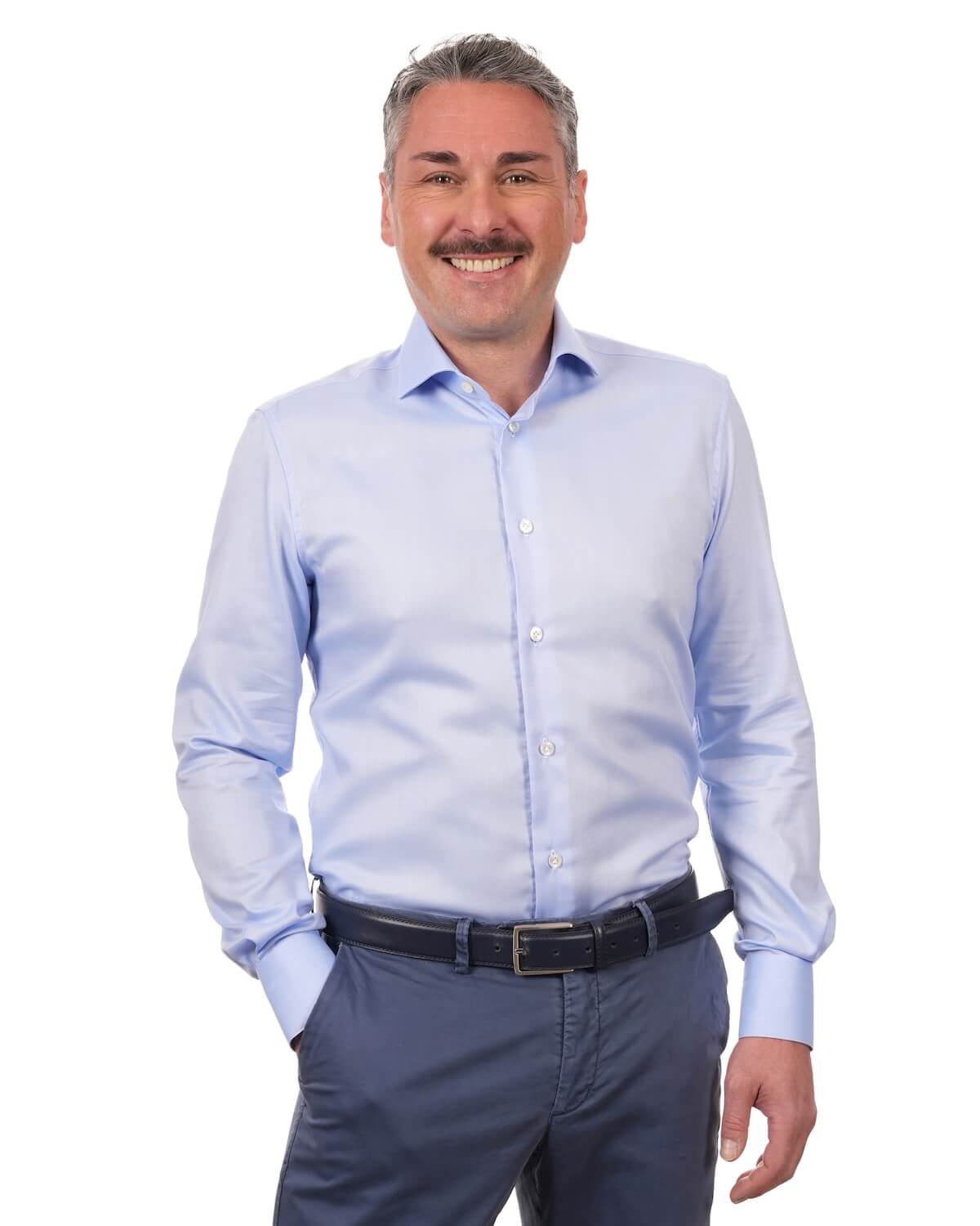 Camicia uomo celeste in Oxford 100% cotone no stiro, 195 g. Collo francese con stecche estraibili, polso spinzato, bottoni in madreperla e cuciture a riva. Ideale per business e occasioni formali.
