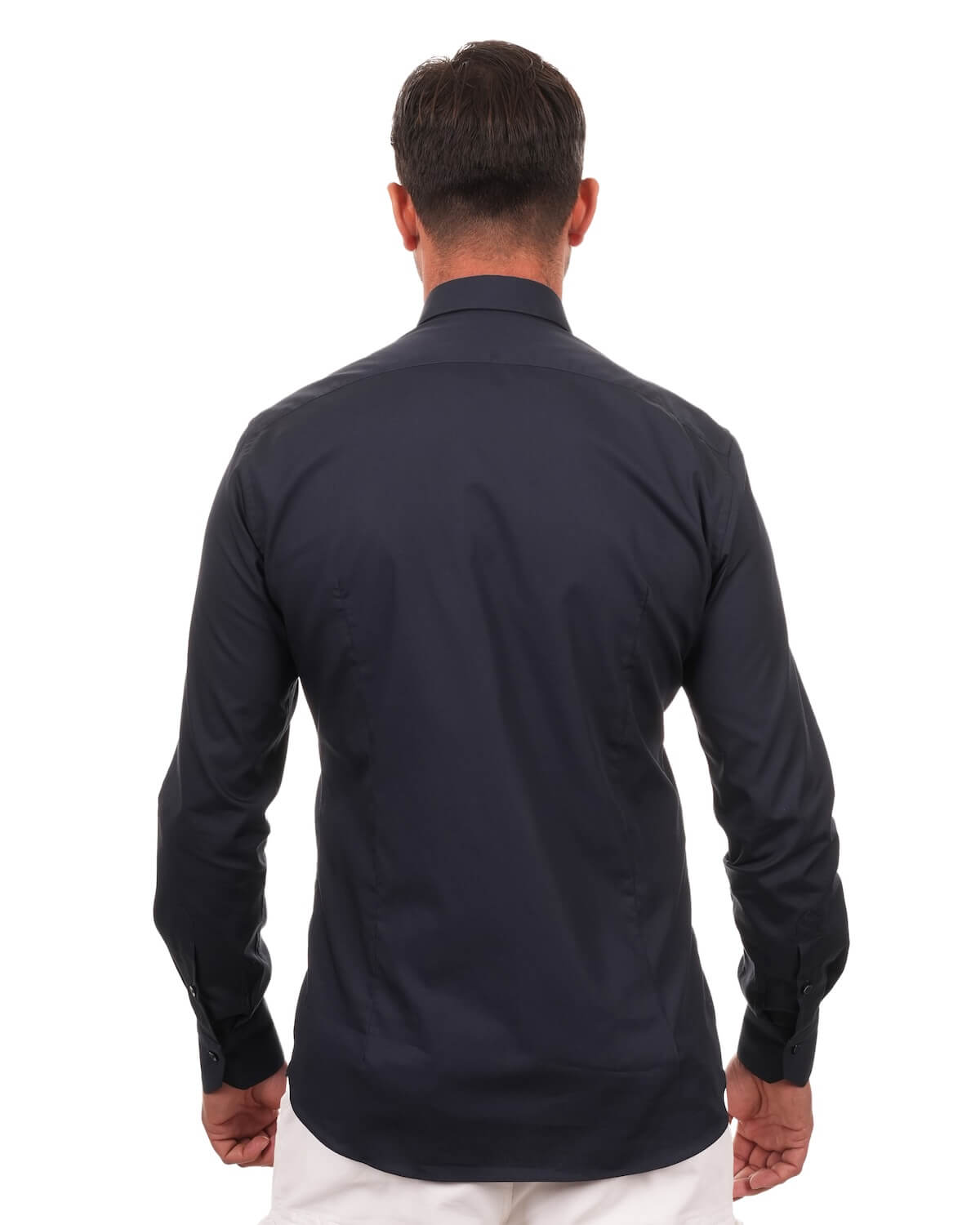 Il collo francese moderno, costruito con anima indeformabile e stecche estraibili, è pensato per essere indossato sia con cravatta o papillon che senza, mantenendo sempre una forma definita e contemporanea. Il polso spinzato completa il capo con un dettaglio pulito ed elegante, mentre i bottoni in madreperla nobilitano la camicia con un tocco di pregio e luminosità.
