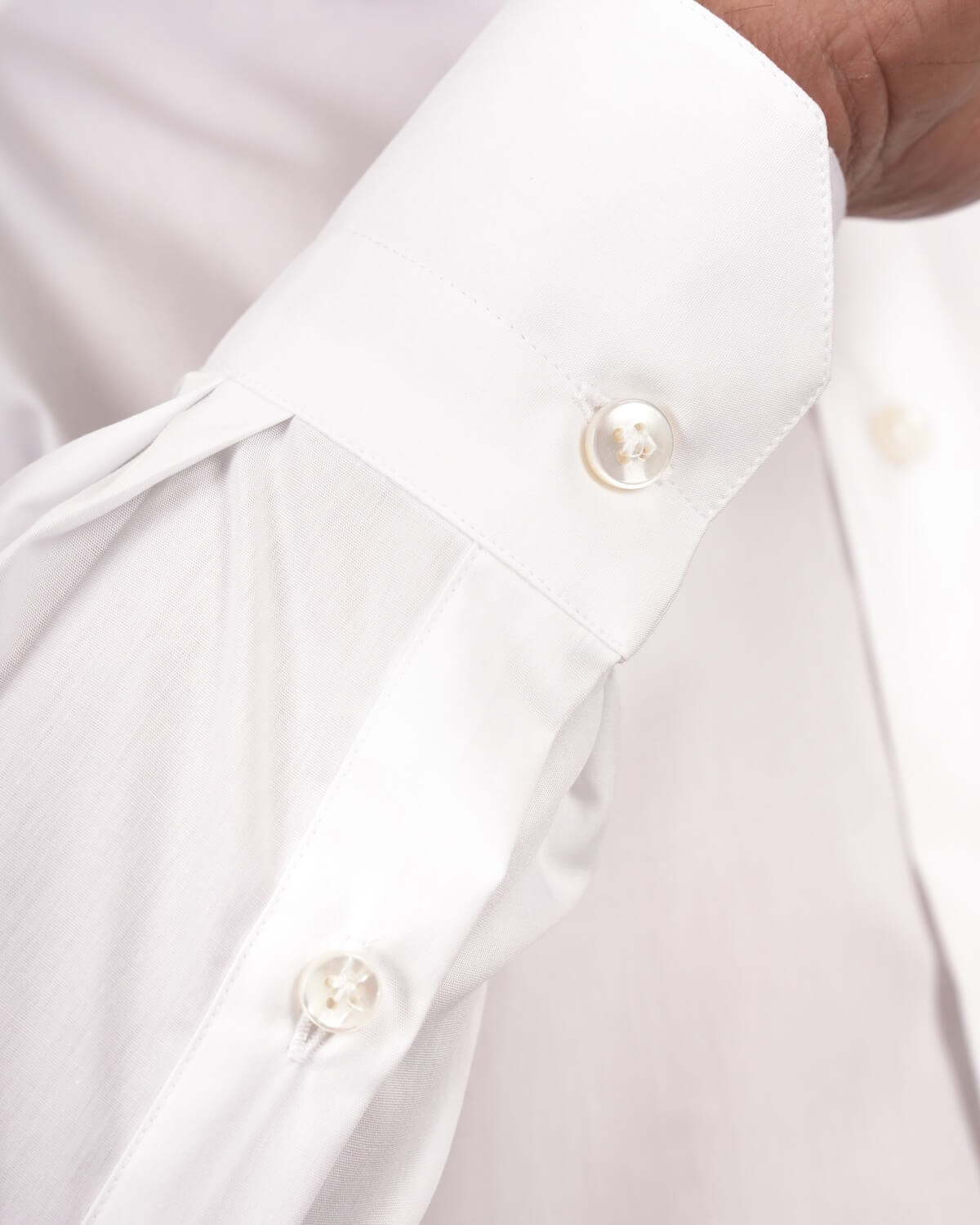 Le cuciture a riva e i bottoni in madreperla nobilitano ulteriormente la camicia, esprimendo attenzione ai dettagli e pulizia esecutiva. Il colore bianco, intramontabile e luminoso, rende questo modello un riferimento per chi cerca un capo impeccabile e versatile.