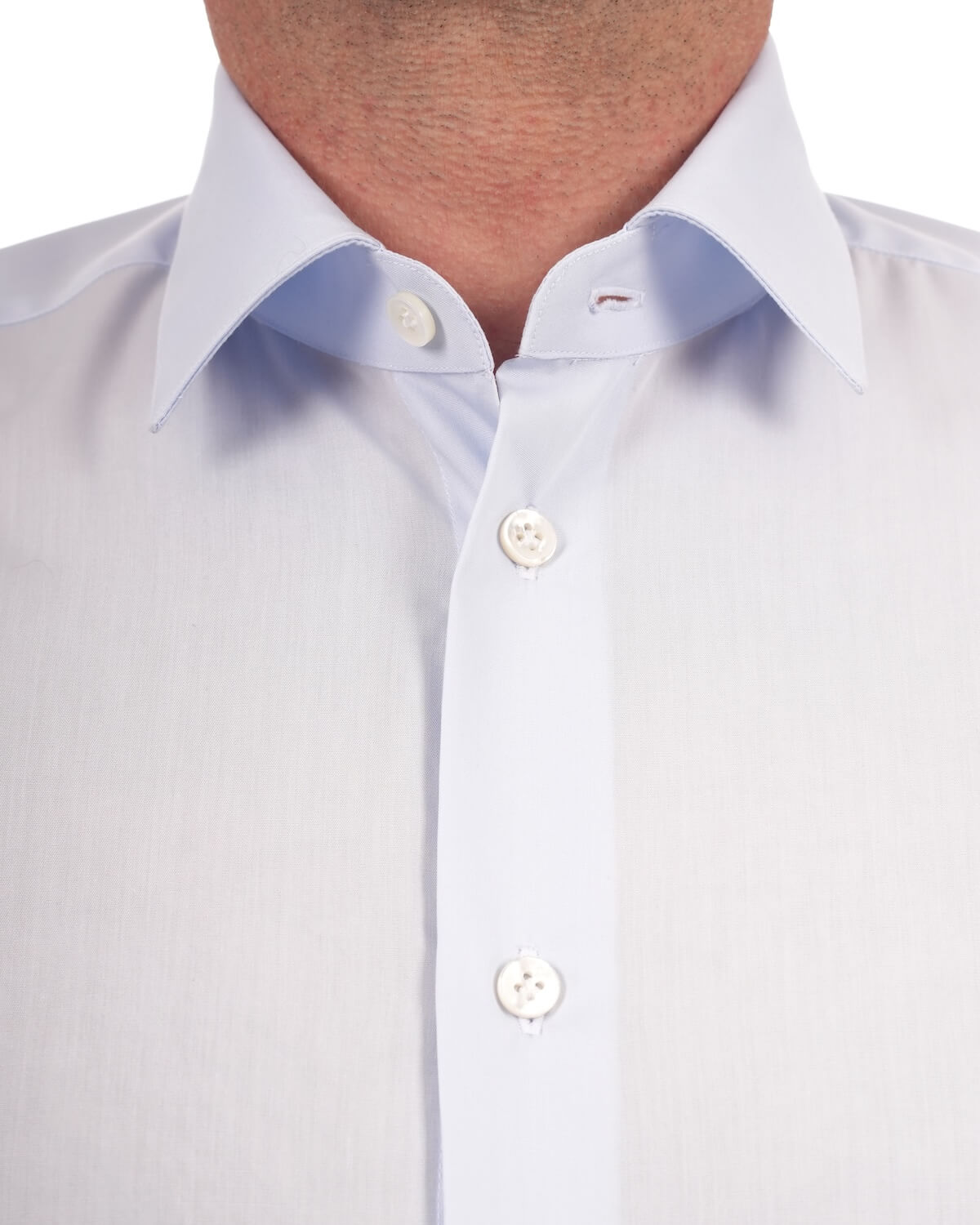 Le cuciture a riva e i bottoni in madreperla valorizzano ulteriormente la camicia, riflettendo l’attenzione ai dettagli e la cura sartoriale del brand. Il colore celeste chiaro, luminoso e delicato, conferisce al capo un’eleganza sofisticata e contemporanea.